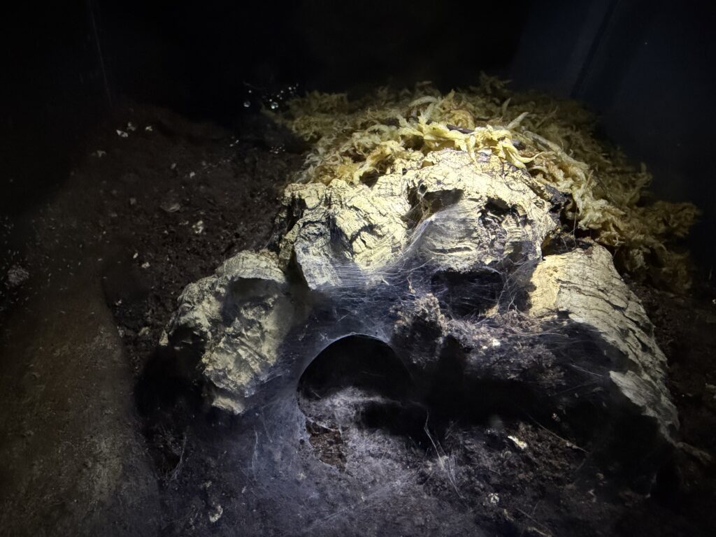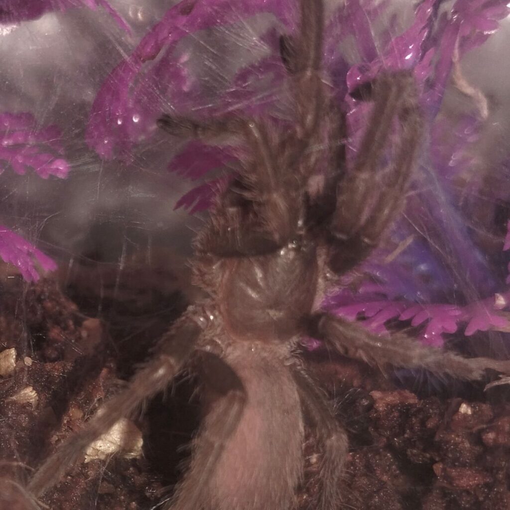 Small beginnings for what will be a large spider. Webbed up it’s enclosure on its first night, taking extra small crickets just fine. Surprisingly active in the evenings.