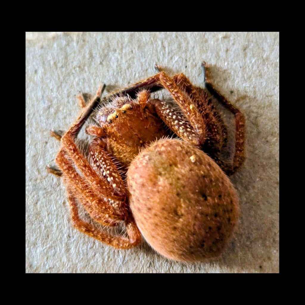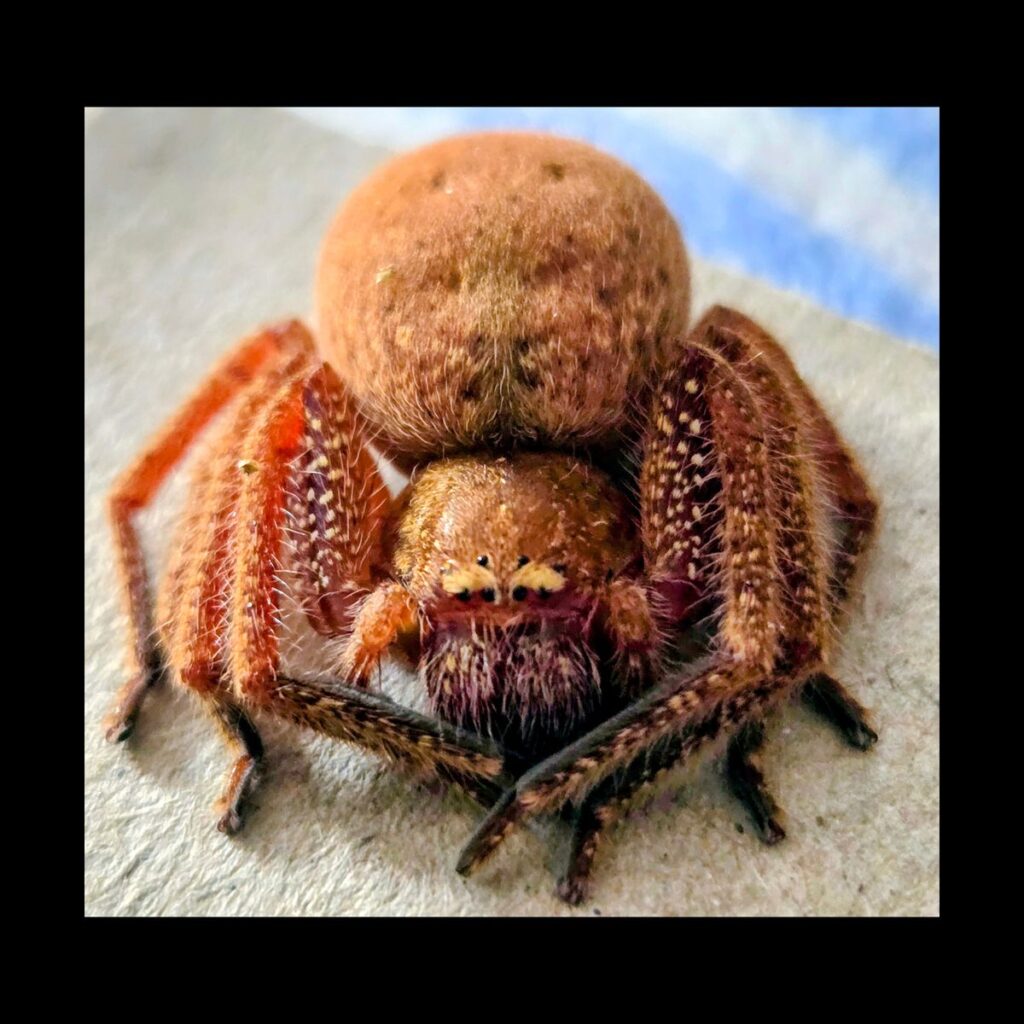 Neosparassus diana is a small huntsman found in the wetter parts of southern Australia, unlike most huntsmans they prefer to live on grasses and bushes instead of on tree bark. They are bright orange in colour with numerous white spots and a set of prominent white “eyebrows”